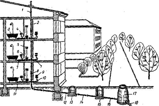 1 —- вытяжная вентиляционная труба; 2—стояк; 3 — ванна; 4 — умывальник; 5 — смывной бачок; 6 —унитаз; 7 — отводная труба; 8 — ревизия; 9 — мойка или раковина на кухне; 10 — гидравлический затвор; 11— напольный сифон; 12— выпуск; 13 — смотровой колодец на дворовой сети; 14 — дворовая сеть; 15 — контрольный колодец; 16 — соединительная ветка; 17 — смотровой колодец на уличной сети; 18 —уличная сеть.