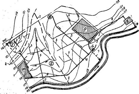 I-III — бассейны канализования; 1 — граница города; 2—границы бассейнов канализования: 3—уличная сеть; 4—напорные водоводы; 5—коллекторы; 6 — главный коллектор; 7 — аварийные выпуски; 8 —загородный или отводной коллектор; 9— выпуск в водоем.