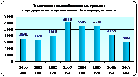 В 2007 году существенно снизились масштабы высвобождения с предприятий и организаций Волгограда: всего за период с января по декабрь 2007 года было высвобождено 3,0 тыс. человек, что на 1,2 тыс. человек меньше аналогичного периода 2006 года.