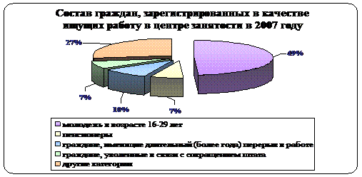 Основной показатель эффективности работы центра занятости населения – это количество трудоустроенных граждан за отчетный период. В 2007 году центром занятости было трудоустроено 26,8 тыс. человек, что составило 60,1% от числа граждан, зарегистрированных в качестве ищущих работу.