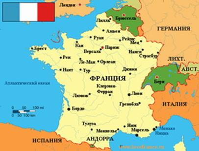 Франция – самая большая страна Западной Европы. С севера на юг и с запада на восток Франция протянулась почти на 1000 км, после России это самая большая европейская страна. По площади (552 тыс. кв. км, включая Корсику) она более чем вдвое превосходит как Великобританию, так и Германию. Столица Франции – город Париж. К Франции относятся остров Корсика и несколько других более мелких островов в Средиземном море и Балтийском заливе. Население страны составляет 53 млн. человек (2007г.).
