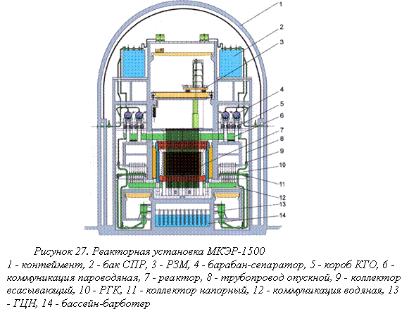 Реактор МКЭР-1500 (рис. 27.) проектируется как эволюционное развитие отечественных канальных водографитовых реакторов на тепловых нейтронах. Наряду с достоинствами современных отечественных водографитовых реакторов, в реакторной установке реализованы принципиально новые технологические решения, позволяющие значительно усовершенствовать технико-экономические показатели установки. При проектировании МКЭР-1500 основными направлениями для улучшения технико-экономических показателей являются: