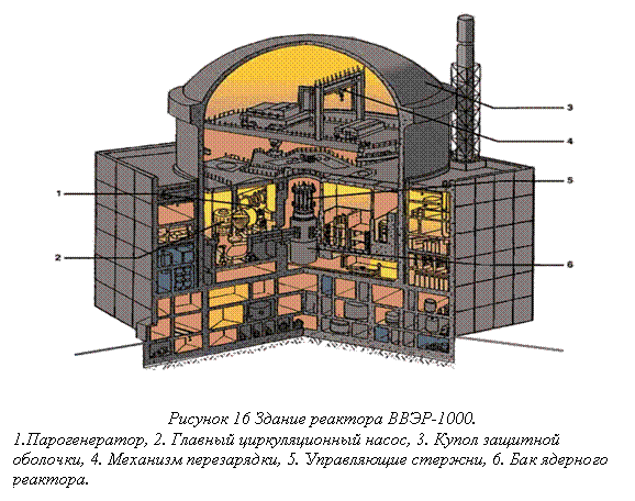 Главный корпус здания, для размещения реактора состоит из двух частей: реакторно-парогенераторного и турбинного цехов. Реакторно-парогенераторный цех двухконтурной АЭС располагается внутри герметичной железобетонной оболочки. Для реактора ВВЭР-100 диаметр ее цилиндрической части составляет 47,7м, а ее высота – 67,5м. В верхней части она перекрыта сферическим куполом. Оболочка обеспечивает биологическую защиту и локализацию радиоактивности в нормальной эксплуатации. Кроме того, внутри оболочки реактор и парогенератор разделяются круговой железобетонной стеной толщиной 1-1,5 м, предназначенной для биологической защиты.