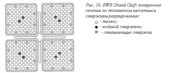 Цилиндрическая активная зона собрана из 800 топливных сборок, установленных рядами в квадратной решетке, как показано на рис. 1.20. Каждая сборка состоит из набора цилиндрических твэлов, установленных в квадратной решетке 8X8. Оболочки твэлов изготовлены из циркалоя-2, а сборка заключена в кожух квадратного сечения из циркалоя-4. С обоих торцов кассеты установлены опорные пластины, нижняя из которых имеет входной патрубок, который вставляется в гнездо опорной конструкции и направляет поток теплоносителя к твэлам. Использование изолированных каналов для охлаждения твэлов позволяет индивидуально калибровать поток теплоносителя в каждом пучке твэлов в соответствии с плотностью энерговыделения в топливе. Топливо находится в твэлах в виде таблеток диаметром 10,6 мм. В каждой кассете установлены твэлы с различным обогащением топлива. Это позволяет уменьшить неравномерность тепловыделения внутри кассеты. Два стержня в центре кассеты не содержат топлива и заполнены водой ("водяные стержни"). Они обеспечивают дополнительное замедление нейтронов и тем самым уменьшают "выедание" потока нейтронов в центре кассеты. Компенсация уменьшения реактивности при выгорании топлива обеспечивается выгорающими поглотителями нейтронов (гадолинием), добавленными в топливные таблетки. Среднее обогащение топлива в кассете при равновесном топливном цикле составляет 2,2 - 2,8%.