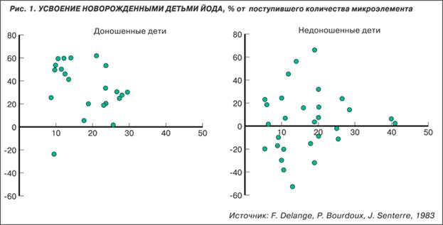 Проведенные F. Delange с соавторами в 1983 г. балансовые исследования на высоком методическом уровне впервые доказали, что 45% и более недоношенных новорожденных детей имеют разную степень отрицательного йодного баланса и выводят йода намного больше, чем потребляют (табл. 1).