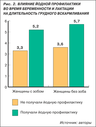 В этих условиях единственной возможностью улучшить йодобеспеченность новорожденных детей является назначение беременным и кормящим женщинам йодсодержащих препаратов. По нашим данным, прием физиологических доз йодсодержащих препаратов (100-150 мкг/день) беременными и кормящими женщинами достоверно увеличивает продолжительность лактации, в среднем до 5 месяцев (рис. 2) и повышает до нормы содержание йода в грудном молоке (рис. 3). Установлено, что сроки нормализации состава грудного молока зависят от степени выраженности у матери йододефицитных заболеваний и длительности профилактики и коррекции.
