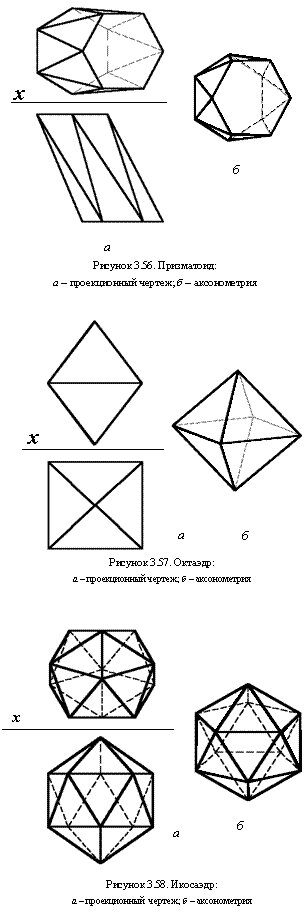 Построение графического отображения многогранника сводится к построению проекций его вершин и ребер. Кратко охарактеризуем геометрические свойства некоторых многогранников и выполним их проекции.