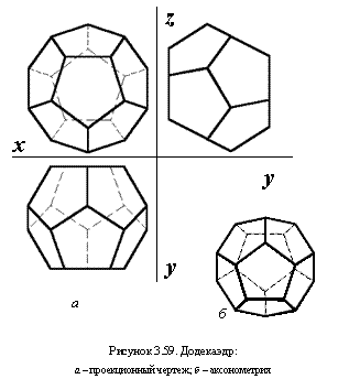 Додекаэдр – правильный двенадцатигранник, ограниченный двенадцатью правильными и равными пятиугольниками, соединенными по три у каждой вершины (рисунок 3.59).