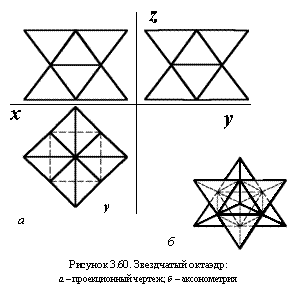 Звездчатый октаэдр. Восемь пересекающихся плоскостей граней октаэдра отделяют от пространства новые «куски», внешние по отношению к октаэдру. Это малые тетраэдры, основания которых совпадают с гранями октаэдра (рисунок 3.60). Его можно рассматривать как соединение двух пересекающихся тетраэдров, центры которых совпадают с центром исходного октаэдра. Такой звездчатый многоугольник в 1619 г. описал Кеплер и назвал его stella ostangula – восьмиугольная звезда.
