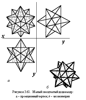 Малый звездчатый додекаэдр – звездчатый додекаэдр первого продолжения. Он образован продолжением граней правильного выпуклого додекаэдра до их пересечения. Каждая грань выпуклого додекаэдра при продолжении сторон образует правильный звездчатый пятиугольник (рисунок 3.61). Пересекающиеся плоскости граней додекаэдра отделяют от пространства новые «куски», внешние по отношению к додекаэдру. Это двенадцать правильных пятиугольных пирамид, основания которых совпадают с гранями додекаэдра.