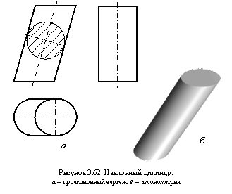 Цилиндр – геометрический объект, ограниченный цилиндрической поверхностью и двумя плоскостями, называемыми основаниями. В зависимости от угла наклона образующих цилиндрической поверхности к основанию различают прямой цилиндр (угол наклона 90°) и наклонный (рисунок 3.62).