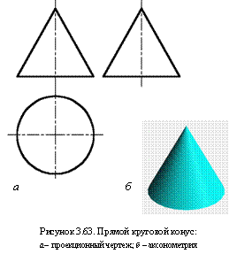 Конус – геометрический объект, ограниченный конической поверхностью и плоскостью, называемой основанием или двумя плоскостями (усеченный конус). Конус может быть прямым (рисунок 3.63) или наклонным.