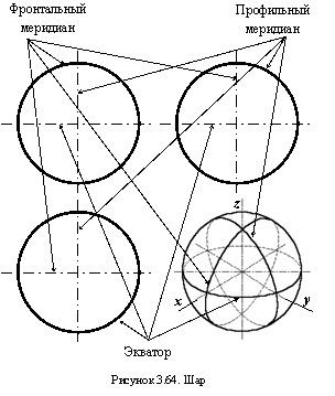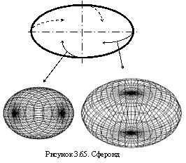 Шар – геометрический объект, образованный вращением круга вокруг его диаметра (рисунок 3.64). При сжатии или растяжении шар преобразуется в эллипсоид, который может быть получен вращением эллипса вокруг одной из осей: если вращение происходит вокруг большой оси, то эллипсоид называется вытянутым; если вокруг малой – сжатым, или сфероидом (рисунок 3.65).