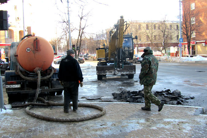 Как уже сообщалось ранее, сегодня утром, около 9.00, в областном центре на пересечении пр. Славы и ул. Князя Трубецкого произошёл прорыв на магистрали холодного водоснабжения. На место происшествия были направлены бригады МУП «Горводоканал» и МУП «Белгородблагоустройство», а также оперативная группа Главного управления МЧС России по Белгородской области. Причиной аварии стали аномальные заморозки, которых труба не выдержала. Устранить последствия происшествия обещали в течение трёх часов с момента начала ремонтных работ. Однако ситуация была осложнена тем, что из трубы беспрестанно лилась ледяная вода, вычерпать её из образовавшегося котлована удалось лишь к обеду. По предварительным прогнозам, ремонт будет завершён не раньше, чем через пару часов.