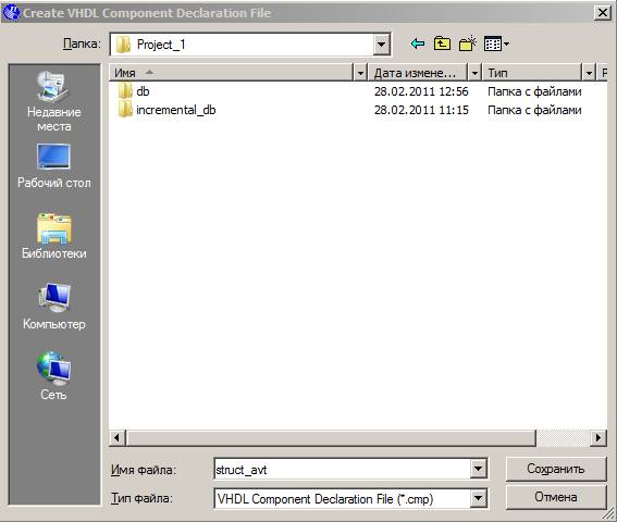 Затем щелкнуть левой кнопкой мыши по строке Create VHDL Component Declaration Files for Current Files. Появится окно, изображенное на рис 2.1.10.1. В поле «Папка» будет указана рабочая папка проекта, в поле «Имя файла» – имя, совпадающее с именем исходного файла, а в поле «Тип файла» будет указан тип VHDL Component Declaration File, имеющий расширение .cmp. Содержимое первых двух полей может быть изменено по желанию пользователя. На рис. 2.1.10.1. приведен вид окна, для случая, когда в качестве исходного файла использован схемный модуль структурного автомата, создание и редактирование которого рассматривалось выше.
