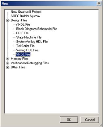 5. На рис. 2.2.2.2. приведен пример выбора строки VHDL File. После этого нажмите кнопку OK в нижней части панели. Появится окно текстового редактора, изображенное на рис. 2.2.2.3.