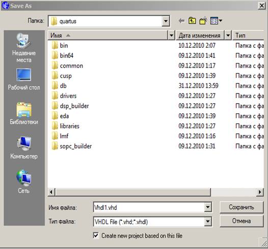 Вновь созданному файлу автоматически присваивается имя с соответствующим расширением. В рассматриваемом примере это имя VHDL1.vhd (см. рис. 2.2.2.3.).