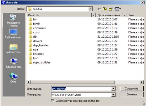 Рис. 2.2.2.5. Пример задания имени avt_mili VHDL файлу