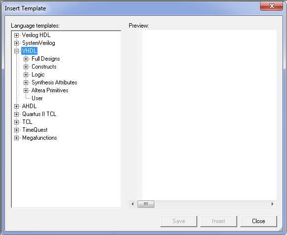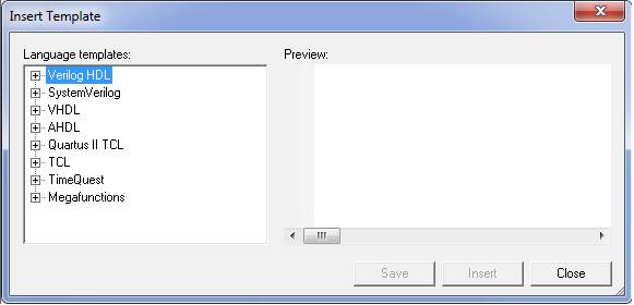 Окно состоит из двух частей. В левой части содержатся шаблоны, представленные в виде иерархической структуры. В правой части представляется фрагмент кода, соответствующий выбранному шаблону. Причем в этом окне можно не только просматривать шаблон, но и редактировать его. На верхнем уровне шаблоны разбиты по категориям в зависимости от используемого языка описания. Имеются также группы TimeQuest и Megafunctions. В категории Megafunctions содержатся шаблоны декларации компонентов проекта. Чтобы раскрыть содержимое каждой категории необходимо щелкнуть левой кнопкой мыши по значку
