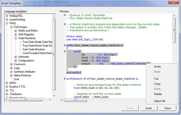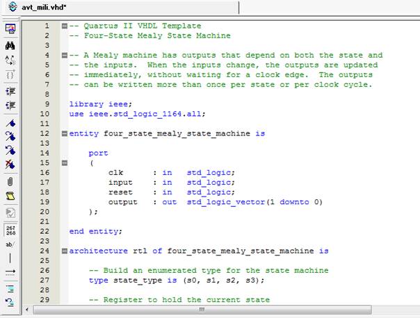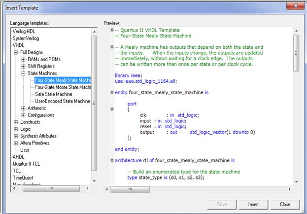 1. Выделите щелчком левой кнопки мыши один шаблон из предлагаемого в левом окне панели Insert Template списка. После этого его текст отобразится в правом окне панели. На рис. 2.2.4.3. приведен пример шаблона описания автомата МИЛИ с четырьмя состояниями.