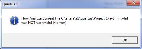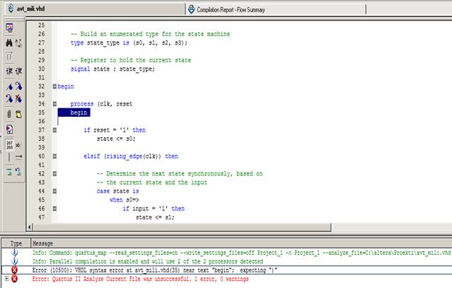Причем в окне сообщений менеджера проекта, будет выведена красным цветом информация о выявленных ошибках с указанием их типа и номеров содержащих их строк в текстовом файле. Если двойным щелчком мыши щелкнуть по сообщению об ошибке, то в окне редактируемого файла строка, содержащая ошибку, выделится синим цветом, что позволит быстро локализовать и устранить ошибку. В исходном шаблоне в операторе process (строка 34) умышленно удалена закрывающаяся скобка, в результате чего при выполнении анализа текущего файла были выявлены ошибки. На рис. 2.2.4.8. приведен пример вывода сообщений об обнаруженных ошибках. Как видно из этого рисунка, выведенное сообщение указывает именно на эту ошибку (см. рис. 2.2.4.8.).