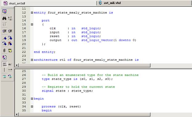 Редактирование текстовых файлов в пакете Quartus II осуществляется стандартным образом. Вначале с помощью курсора мыши выделяется фрагмент текста, а затем с помощью команды Edit на панели инструментов менеджера проекта, или контекстно-зависимого меню, вызываемого нажатием правой кнопки мыши, выделенный фрагмент редактируется. Его можно удалить, переместить, скопировать, вырезать, а в последующем вставить в любое место редактируемого файла или даже в другой файл. Для удобства разработчика в текстовом редакторе реализована возможность использования закладок. Соответствующие кнопки на его панели инструментов позволяют установить закладки, выполнить переход к следующей закладке, вернуться к предыдущей, удалить закладки. В главном окне менеджера проекта допускается одновременное представление и редактирование двух фрагментов текстового файла с помощью горизонтального разделителя окна. Пример, демонстрирующий эту возможность, приведен на рис. 2.2.5.1.