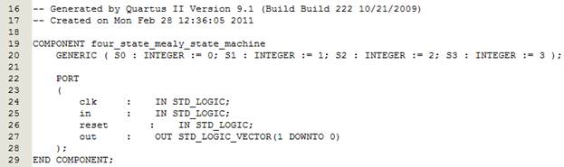 Также как для схемного описания модуля, для текстового описания модуля в пакете Quartus II может быть создана конструкция языка VHDL, в которой исходный модуль будет декларирован как отдельный компонент. Этот компонент затем может использоваться на более высоком уровне иерархии проекта. Создание файла декларации компонента выполняется также как и для схемного модуля (см. раздел 2.1.10.). После успешного создания этот файл автоматически попадает в библиотеку шаблонов в категорию Megafunctions в папку VHDL Components. Пример шаблона с декларацией компонента автомата МИЛИ приведен на рис. 2.2.6.1.