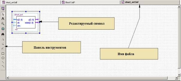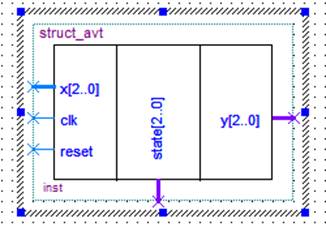 3. С помощью кнопок инструментальной панели графического редактора символов выполните редактирование условного графического обозначения выбранного элемента стандартным образом. В примере, приведенном на рис. 2.3.3. показан вид символа структурного автомата после редактирования. В условном графическом обозначении структурного автомата вывод состояния автомата перенесен в нижнюю часть символа, также введены дополнительные поля для входов и выходов автомата, вход clr_n переименован в reset.