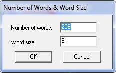 3. В появившемся окне задайте размер памяти: число хранимых слов, размер слова и нажмите кнопку ОК. На рис. 2.4.2.1. показано окно задания размера редактируемой памяти.