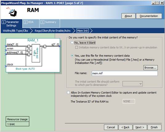 Рис. 2.4.3.3. Окно задания необходимости инициализации и имени файла инициализации памяти