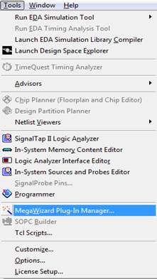 Для конфигурирования мегафункций в состав пакета Quartus II входит специальное средство – менеджер мегафункций (Mega Wizard Plug-in Manager), вызов которого осуществляется из меню Tools, на инструментальной панели менеджера проекта (см. рис. 2.5.1.).