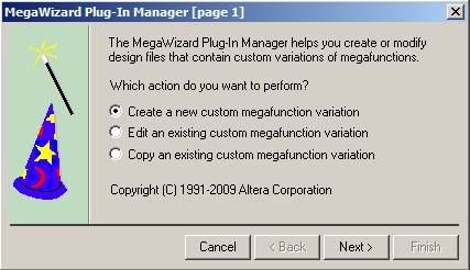 В этом окне менеджер мегафункций предлагает либо создать новую конфигурацию, либо редактировать существующую конфигурацию, либо копировать существующую конфигурацию мегафункции в проект. Для указания своих намерений, пользователь должен выбрать одно из действий путем щелчка мыши в одном из трех окон, соответствующих возможным действиям.