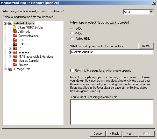 Далее следует указать тип выходного файла описания мегафункции. В примере из возможных языков AHDL, VHDL, Verilog создания описания выбираем VHDL.
