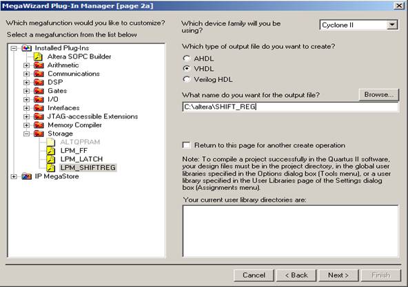 В качестве примера, создадим конфигурацию восьмиразрядного регистра сдвига, с возможностью параллельной загрузки кода, синхронной очисткой и с дополнительным последовательным входом данных. Для этого укажите на первой станице менеджера мегафункций действие «создание новой конфигурации» и нажмите кнопку Next. Появится следующее окно [page2a] менеджера мегафункций, показанное на рис.2.5.4.