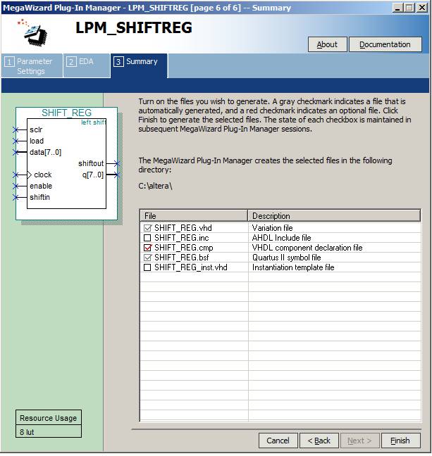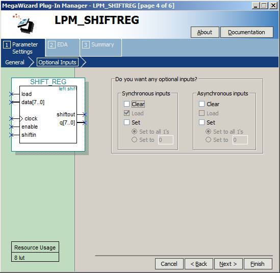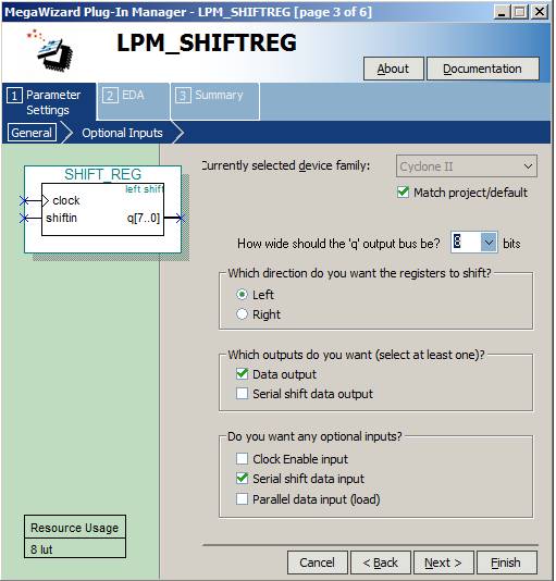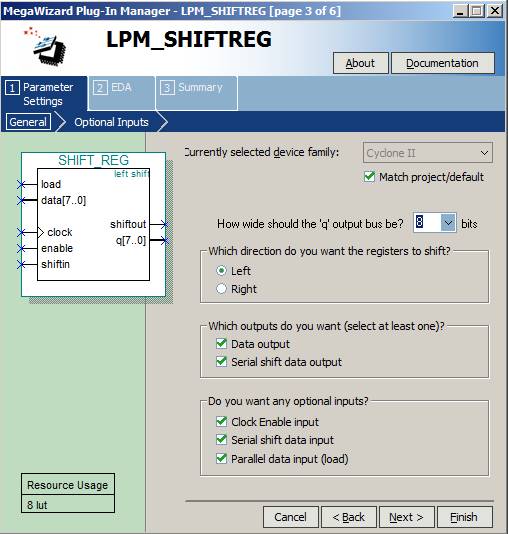 По мере задания параметров создаваемой конфигурации мегафункции в её графическое изображение (символ), представленное в окне менеджера мегафункции, будут вноситься изменения. В нижнем левом углу страницы [page3] указываются ресурсы кристалла, необходимые для реализации мегафункции. В правой верхней части страницы имеется кнопка Documentation, нажав на которую, можно получить документацию по создаваемой мегафункции в разделе Help Quartus II или на сайте фирмы Altera. На рис. 2.5.7. приведен пример заполненной страницы [page3] менеджера для конфигурирования мегафункции регистра сдвига из рассматриваемого примера.