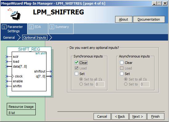 В следующем окне [page4], приведенном на рис. 2.5.8., предлагается продолжить настройку параметров создаваемой конфигурации мегафункции, а именно, конфигурировать дополнительные входы. Можно задать как входы очистки регистра сдвига, так и его установки, причем установки либо в состояние «все единицы», либо заданное состояние. Назначаемые дополнительные входы сброса/установки могут быть как синхронными, так и асинхронными.