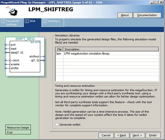 В этом случае, для корректного моделирования созданной конфигурации мегафункции создаётся файл и помещается в соответствующую библиотеку для моделирования. Если установить галочку в окне Generate netlist, то будет формироваться таблица соединений, которая позволит выполнить раннюю оценку временных параметров и аппаратных ресурсов конфигурируемой мегафункции. В рассматриваемом примере на этой странице действий не выполняем, и сразу переходим к следующей странице, нажав кнопку Next.