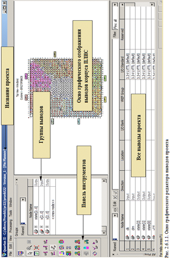 После этого на экране монитора появится окно графического редактора Pin Planner, приведенное на рис.2.6.1.1. Это окно может быть стандартным образом отсоединено и присоединено к главному окну менеджера проекта с помощью соответствующей кнопки на панели инструментов графического редактора.