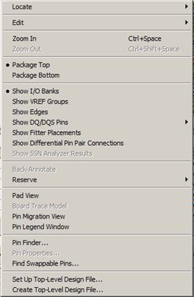 Следует отметить, что в первом окне можно изменить вид отображения выводов корпуса кристалла ПЛИС с помощью контекстно-зависимого меню, вызываемого щелчком правой кнопки мыши. Вид меню приведен на рис. 2.6.1.2. Установка опции Package Top в этом меню приведет к представлению выводов микросхемы при виде на неё сверху. Установка опции Package Bottom приведет к представлению выводов микросхемы при виде на неё снизу.