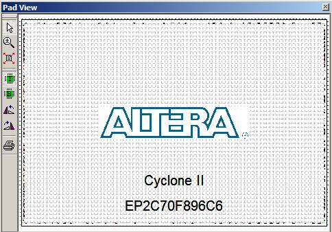 Щелчок мыши по строке Pad View приведет к появлению на экране дополнительного окна с таким же именем, в котором содержится графическое представление площади программируемого кристалла с отображением его ресурсов ввода-вывода (см. рис.2.6.1.3.). Следует отметить, что ресурсы ввода-вывода расположены вдоль граничных сторон кристалла по его периметру. Окно Pad View поможет разработчику установить соответствие координат областей ввода-вывода программируемого кристалла и выводов корпуса микросхемы, его содержащего.