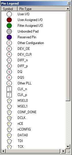 Графическое представление выводов корпуса ПЛИС в окне Package View использует разные условные графические обозначения и разные цвета для отображения выводов разного назначения. Чтобы посмотреть соответствие используемых символов и представляемых типов выводов, можно воспользоваться командой Pin Legend Window из контекстно-зависимого меню (см. рис. 2.6.1.2.). Вызываемое этой командой окно приведено на рис. 2.6.1.4. Как видно из рисунка, выводы корпуса ПЛИС, назначенные пользователем, отображаются красным цветом, назначенные компоновщиком – зеленым. Резервные выводы отображаются синим цветом, неназначенные – серым. Для изображения, например, контактов «земля» (gnd) используется символ