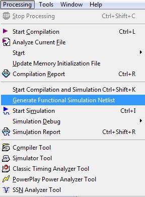 Вначале проверяется правильность функционирования устройства. При этом временные задержки распространения сигналов в схеме не учитываются. Такое моделирование называется функциональным. Для его выполнения достаточно создать модель устройства в виде списка соединений узлов схемы (netlist for simulation). Это можно сделать сразу после ввода описания проекта, выполнив в выпадающем меню Processing менеджера проекта команду Generate Functional Simulation Netlist, как показано на рис. 3.1.1.