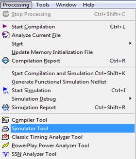 Для настройки инструментальных средств и управления процессом моделирования в пакете Quartus II имеется соответствующая утилита. Чтобы её вызвать, надо нажать кнопку Processing на панели инструментов менеджера проекта, а в выпадающем меню выполнить команду Simulator Tool, как показано на рис. 3.2.1. После этого появится окно Simulator Tool, приведенное на рис. 3.2.2.