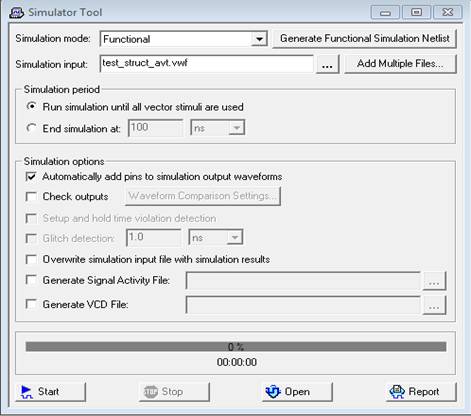 В окне утилиты моделирования содержатся кнопки запуска и останова моделирования, открытия файла с временными диаграммами, открытия файла с отчетом о результатах моделирования. Имеется окно визуализации процесса моделирования с указанием процента выполнения и времени моделирования.