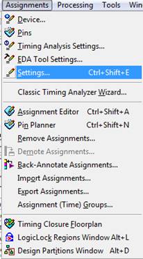 1. На панели инструментов менеджера проекта Quartus II щелкните мышью по кнопке назначения (Assignments).