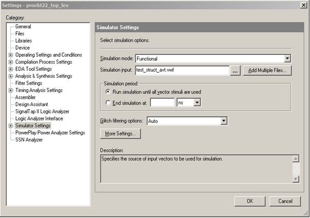 В состав пакета Quartus II входит модуль Simulator, предназначенный для моделирования проекта. Чтобы выполнить функциональное, а затем и временное моделирование некоторого устройства, необходимо создать файл с тестовыми сигналами. Во время моделирования эти сигналы будут подаваться на созданную в процессе проектирования модель устройства с целью получения его реакций на поданные воздействия. Наблюдая результаты моделирования, разработчик определяет соответствие поведения проектируемого устройства требованиям технического задания.