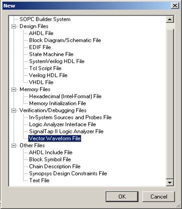 3. В открывшемся окне выберите тип создаваемого файла Vector Waveform File, как показано на рис 3.4.2. и нажмите кнопку ОК.