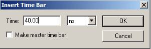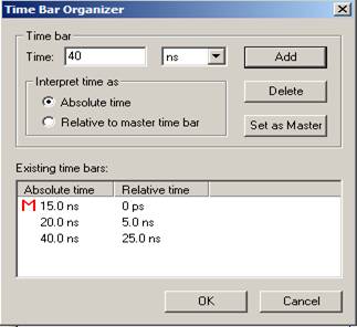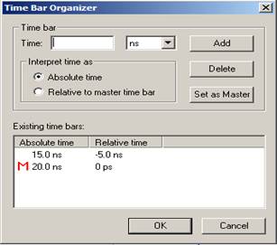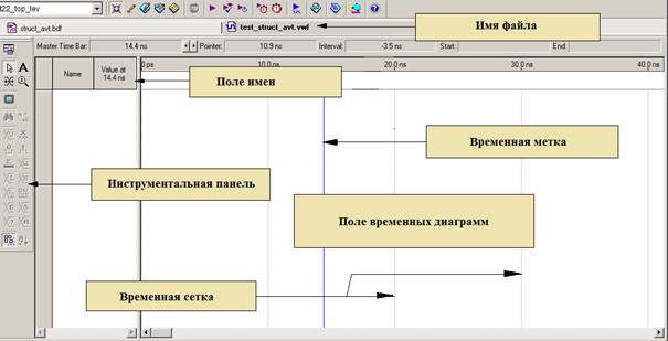 Координата главной временной метки отображается в окне Master Time Bar в верхней части панели редактора временных диаграмм. В поле имен, рядом с именем сигнала или шины указывается соответствующее значение сигнала или шины, принимаемое в отмеченный главной временной меткой момент времени.