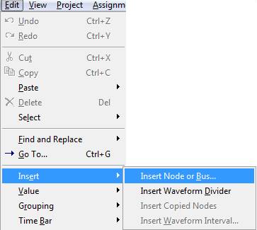 Редактирование временных диаграмм в пакете Quartus II осуществляется стандартным образом. Вначале с помощью курсора мыши выделяется фрагмент временных диаграмм, как это было описано выше. Затем с помощью команды Edit из динамического меню менеджера проекта, или контекстно-зависимого меню, вызываемого нажатием правой кнопки мыши, с выделенным фрагментом осуществляются типовые операции редактирования. А именно, выделенный фрагмент можно удалить, переместить, скопировать, вырезать, а в последующем вставить в любое место редактируемого файла, или даже в другой файл.