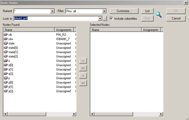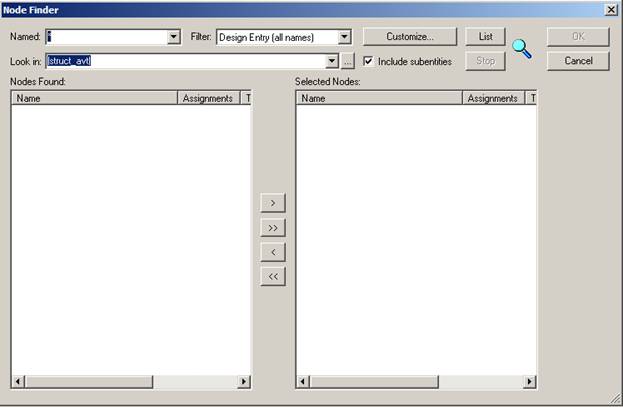 Для нахождения искомых сигналов нажмите кнопку List, после чего в левом окне Node Finder появится список имен, удовлетворяющих заданному критерию поиска.
